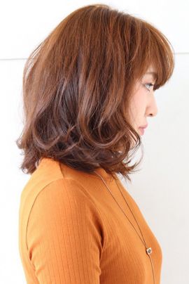 ゆるいパーマのかわいいロブスタイルです!トップのレイヤーがふんわり感を出しています。セミウェットな質感と外ハネがとってもトレンディーなヘアです。