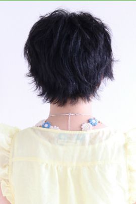 オン眉バングはラウンドさせて女性らしく。 シルエットを綺麗にみせるショートヘアは、毛先をハネさせることで一気に気分が明るくなります!あえての黒髪がポイント。